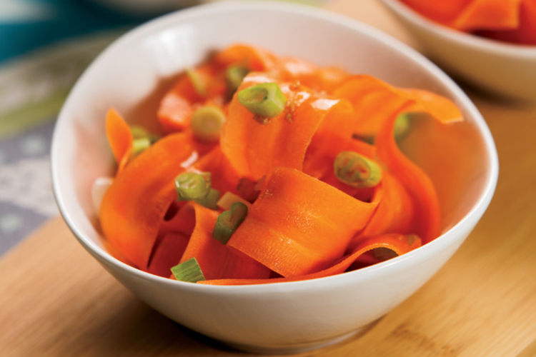 Tangy soy sauce, sesame oil and green onions add Asian flare to a curled carrot slaw. Get the recipe here.